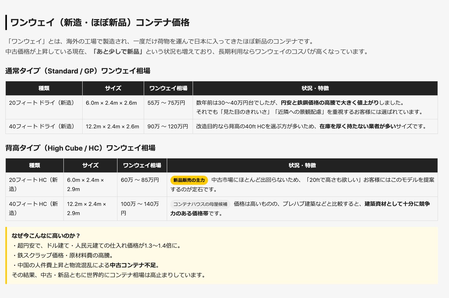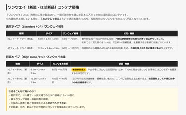 中古コンテナもワンウェイ(新造)コンテナも、価格とリスクを正直に公開します。